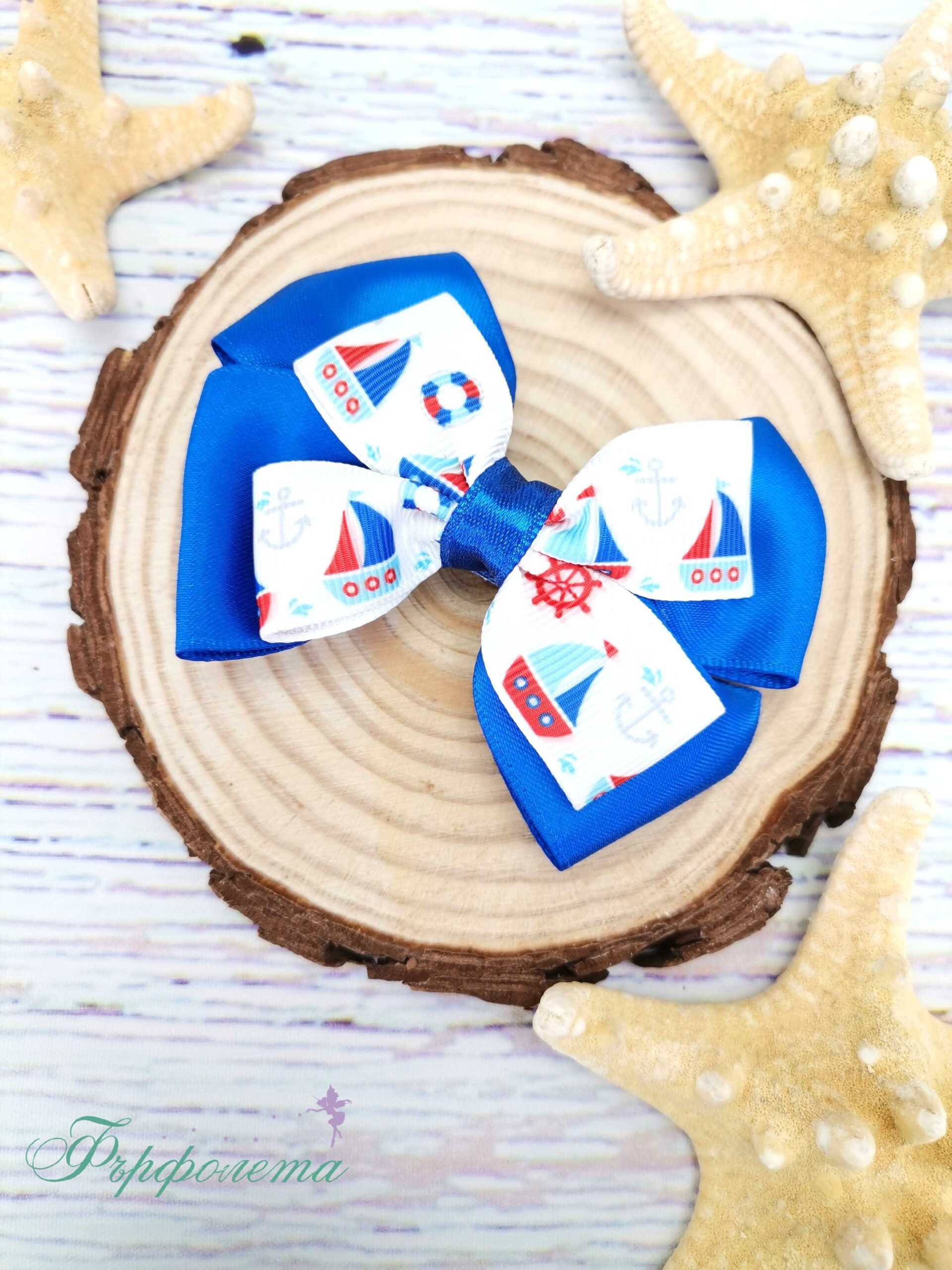 Нежна ръчно изработена морска фиба от два пласта. Матов син сатен и бял рипс с корабчета се комбинират в красив аксесоар за коса с морска тематика.