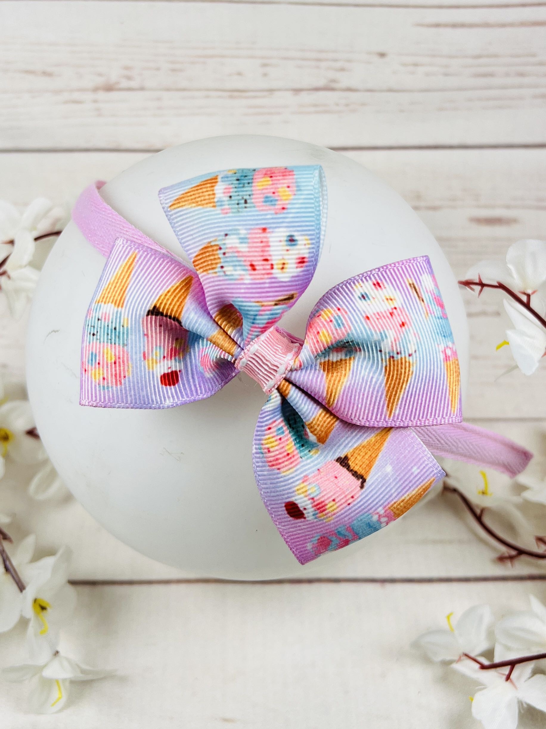 Нежна диадема ръчна изработка с фиба към нея в ментово и розово. С вкус на ментов сладолед и ягодов сироп, тази диадема ще краси главата на любимото дете.