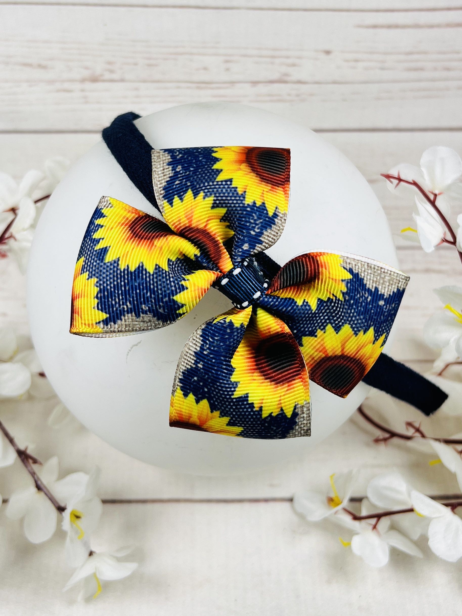 Диадема ръчна изработка с нежни слънчогледи. Синьо с жълти слънчогледи на голяма панделка прикрепена към фиба и диадема.