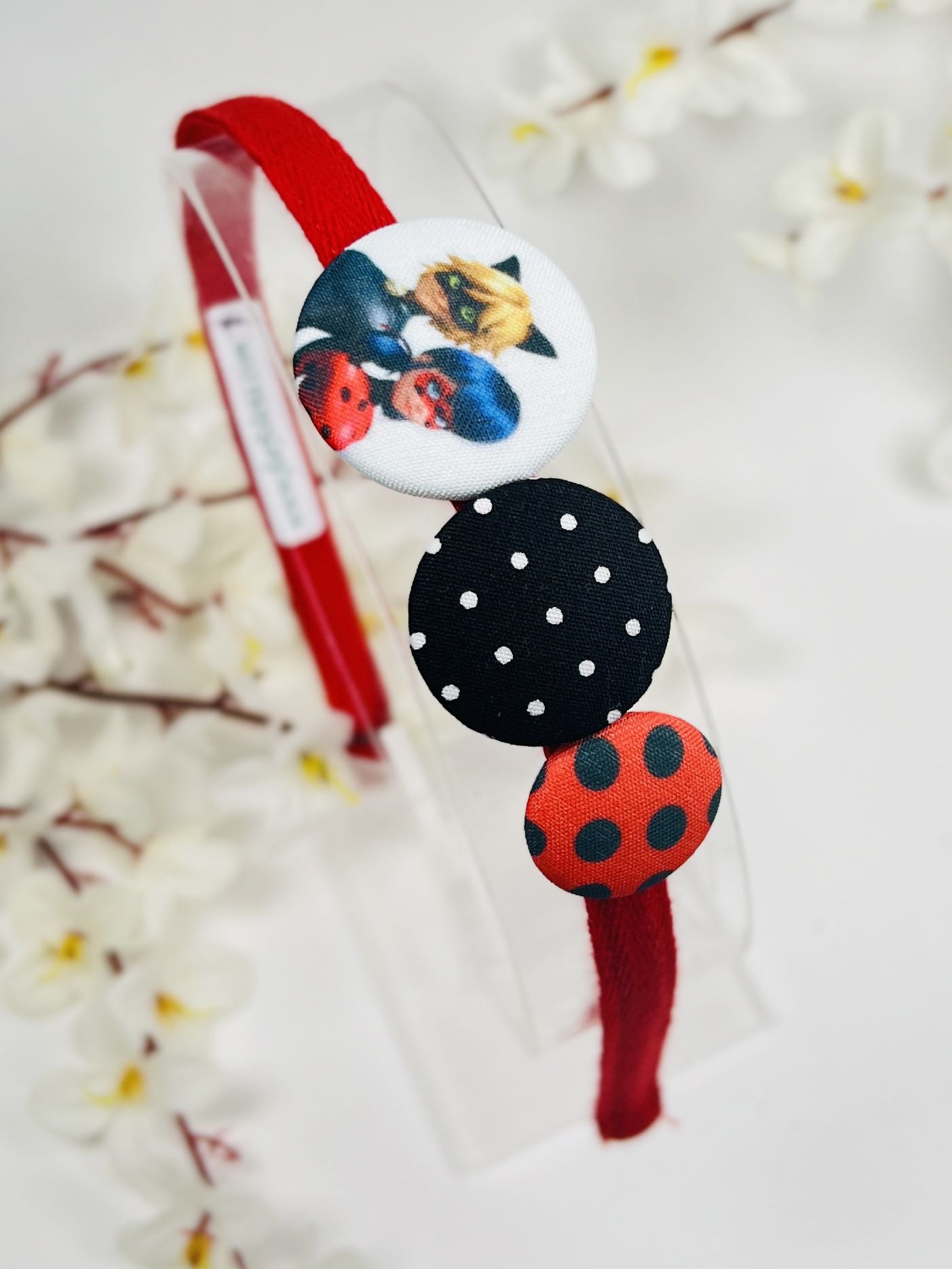 Ръчно изработена диадема с копчета. С любимите герои Калинката и Черния котарак.