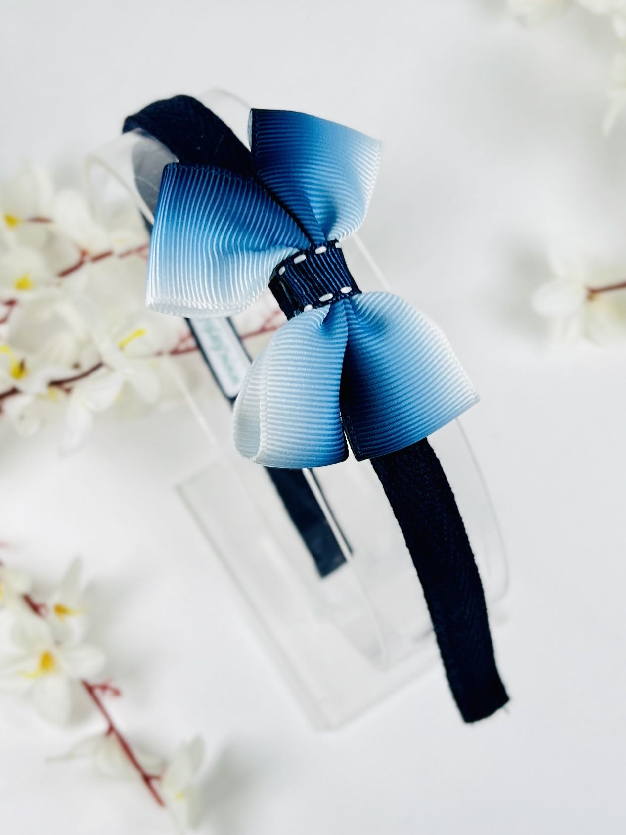 Диадема ръчна изработка е панделка в синьо с преливащо бяло. Панделката-фиба е закачена за мека основа като носи блясък в косите за празник или делник.