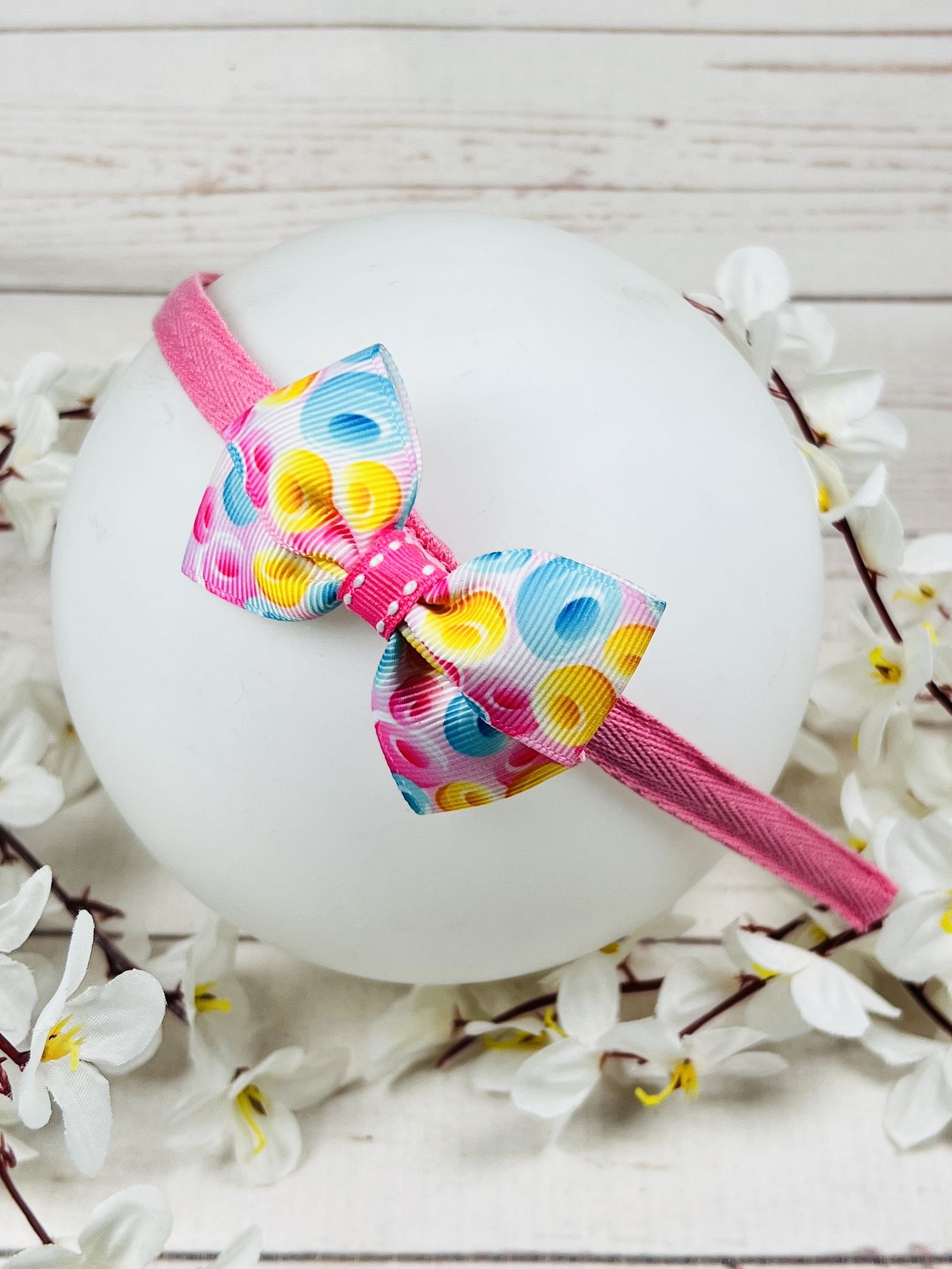 Весела диадема ръчна изработка с понички. Свеж принт върху панделка на диадема. Сладък аксесоар за коса за деца и възрастни.