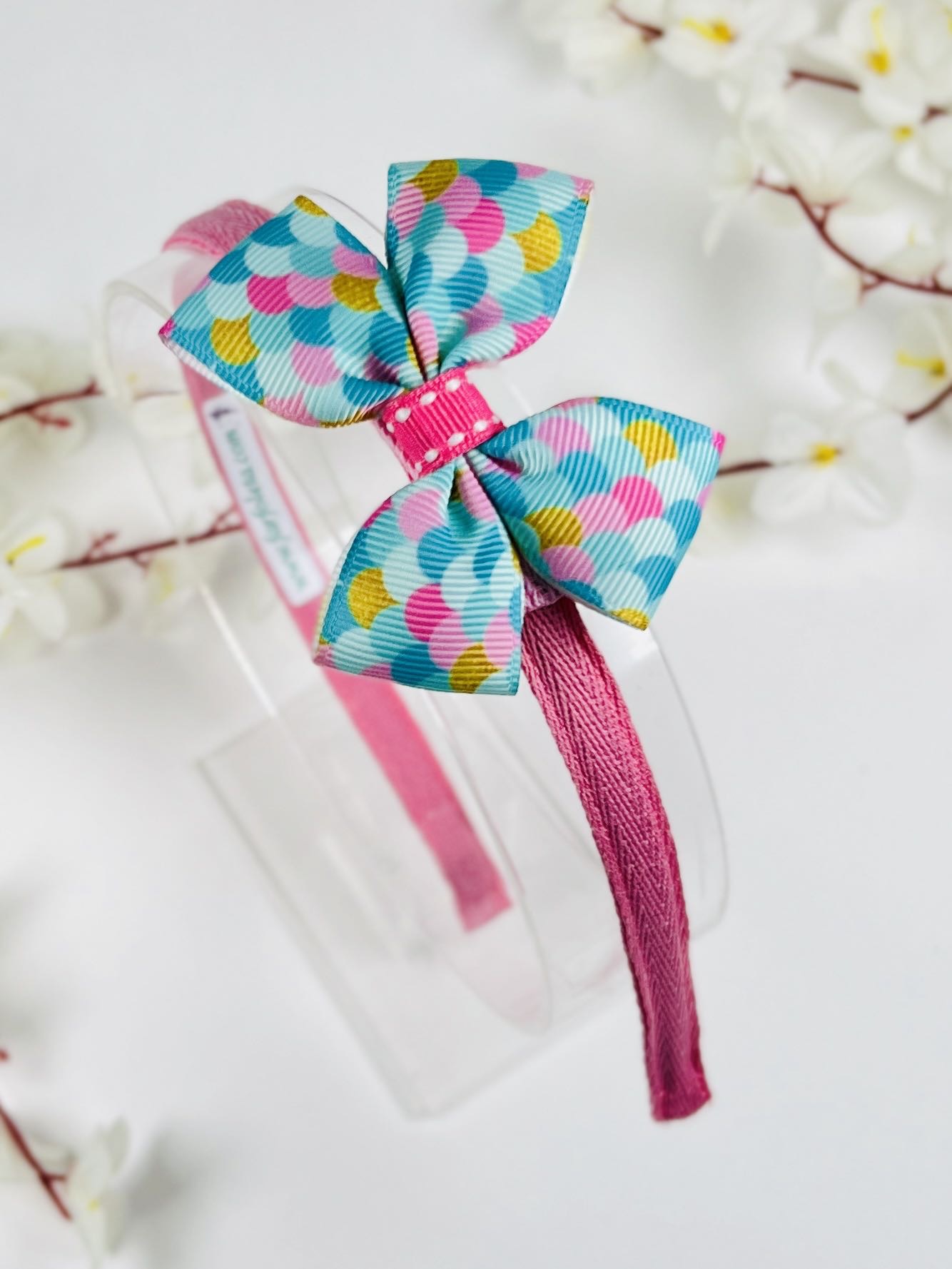 Елегантна диадема с фиба панделка с рибешки люспи. Свежи цветове и креативен дизайн струят от тази нежна диадема. Подходяща е за малки и големи момичета.