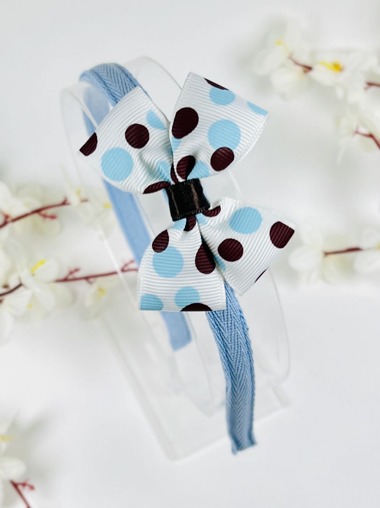 Весела ръчно изработена диадема с фиба панделка обсипана с точки. Нестандартен цвят и идеално допълнение към дънковите дрешки на момиченцата. Диадемата и панделката могат да се разделят и да се комбинират с другите аксесоари от Фърфолета.