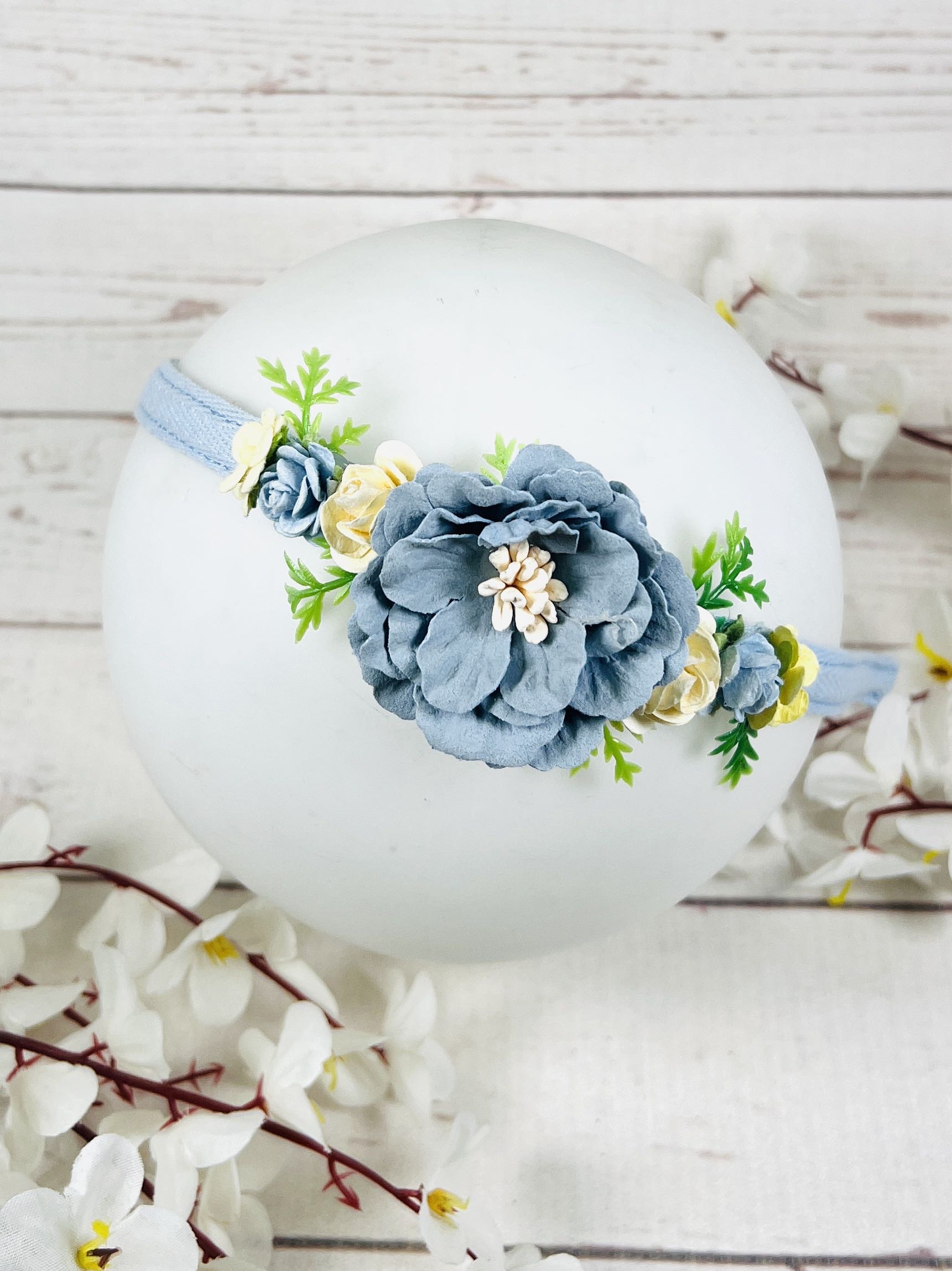 Нежна ръчно изработена диадема с цветя достойна за булка. Рози в синьо и жълто върху облечена в плат основа. Удобен аксесоар за коса за великия ден.