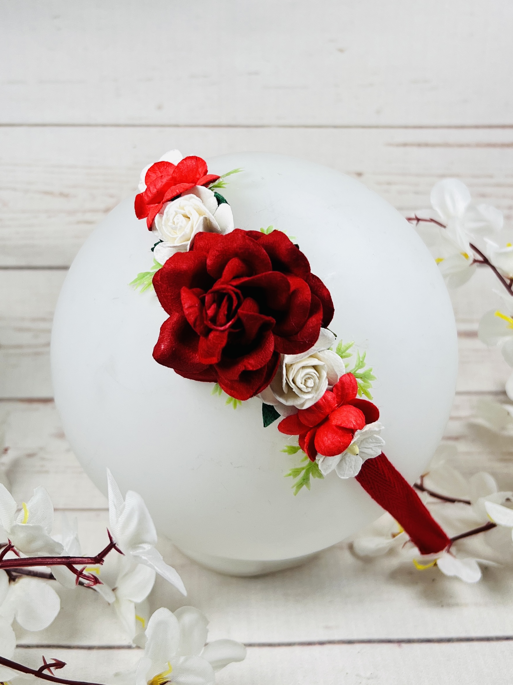 Ръчно изработена диадема с цветя в традиционните бели и червени цветове. Подходяща както за носия, така и за ежедневните тоалети, тази диадема радва малки и големи.
