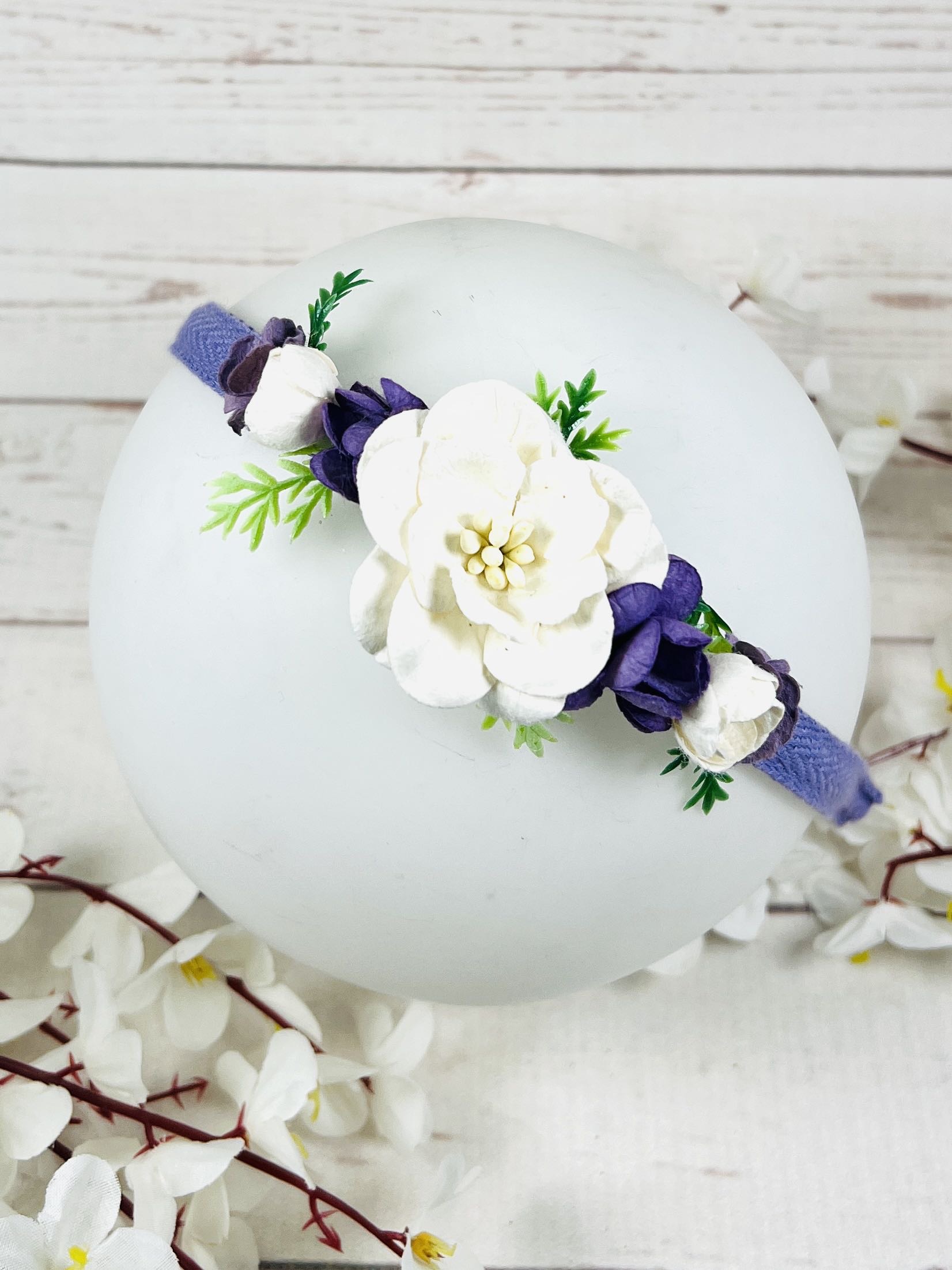 Красива ртъчно изработена диадема с цветя в преливащи бяло лилави цветове. Нежни рози са поставени на удобна диадема за деца и възрастни.