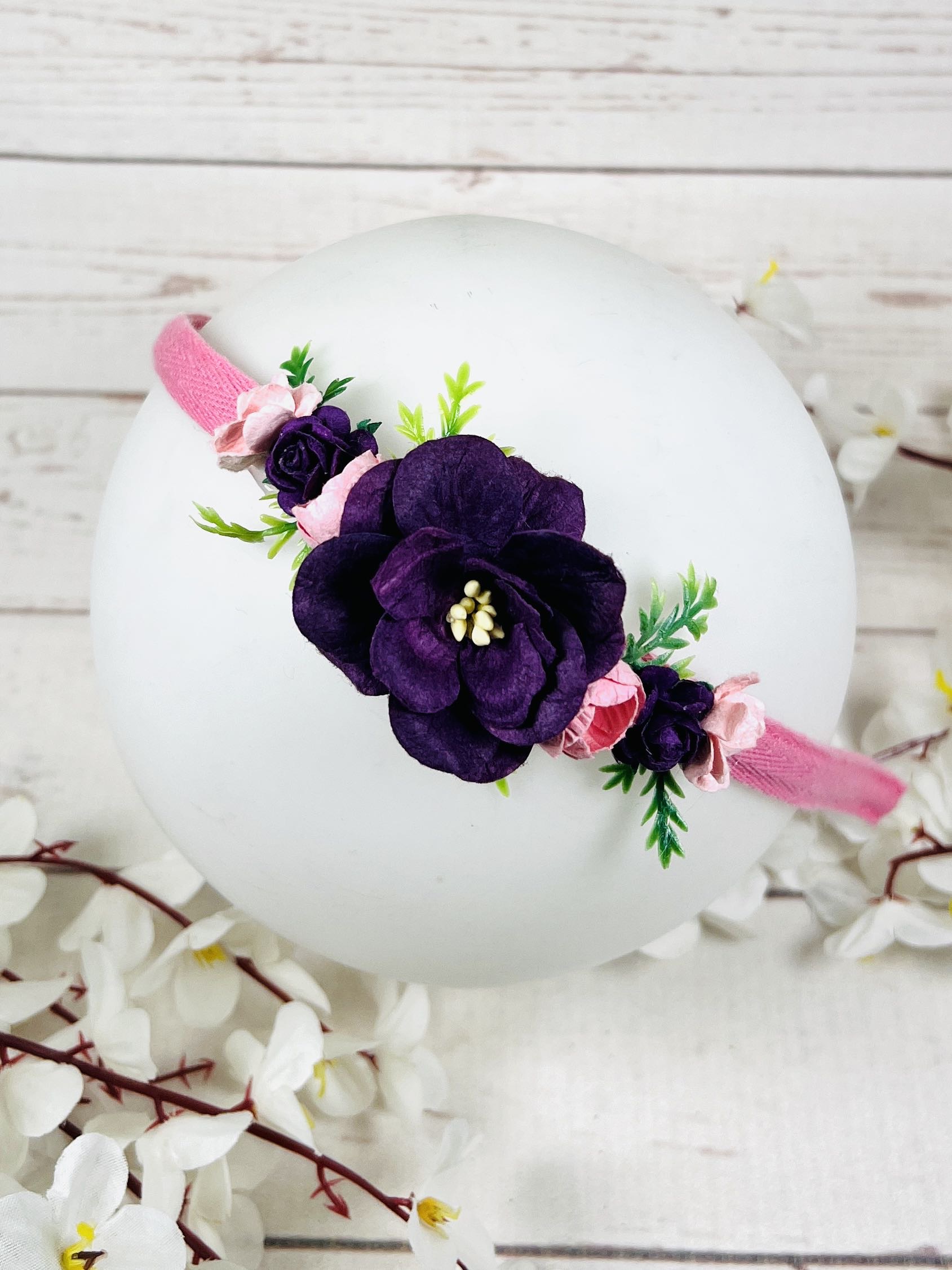 Приказна лилава ръчно изработена диадема с цветя. Голямата роза в боровинков цвят създава сил и класа на тази ефектна диадема.