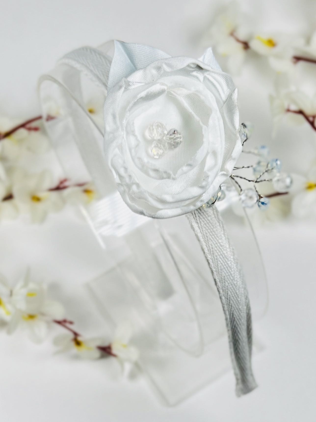 Ръчно изработена диадема с цвете от снежен сатен. Сякаш в ледена м агия е обгърната тази нежна диадема с прикачено цвете на фибичка.