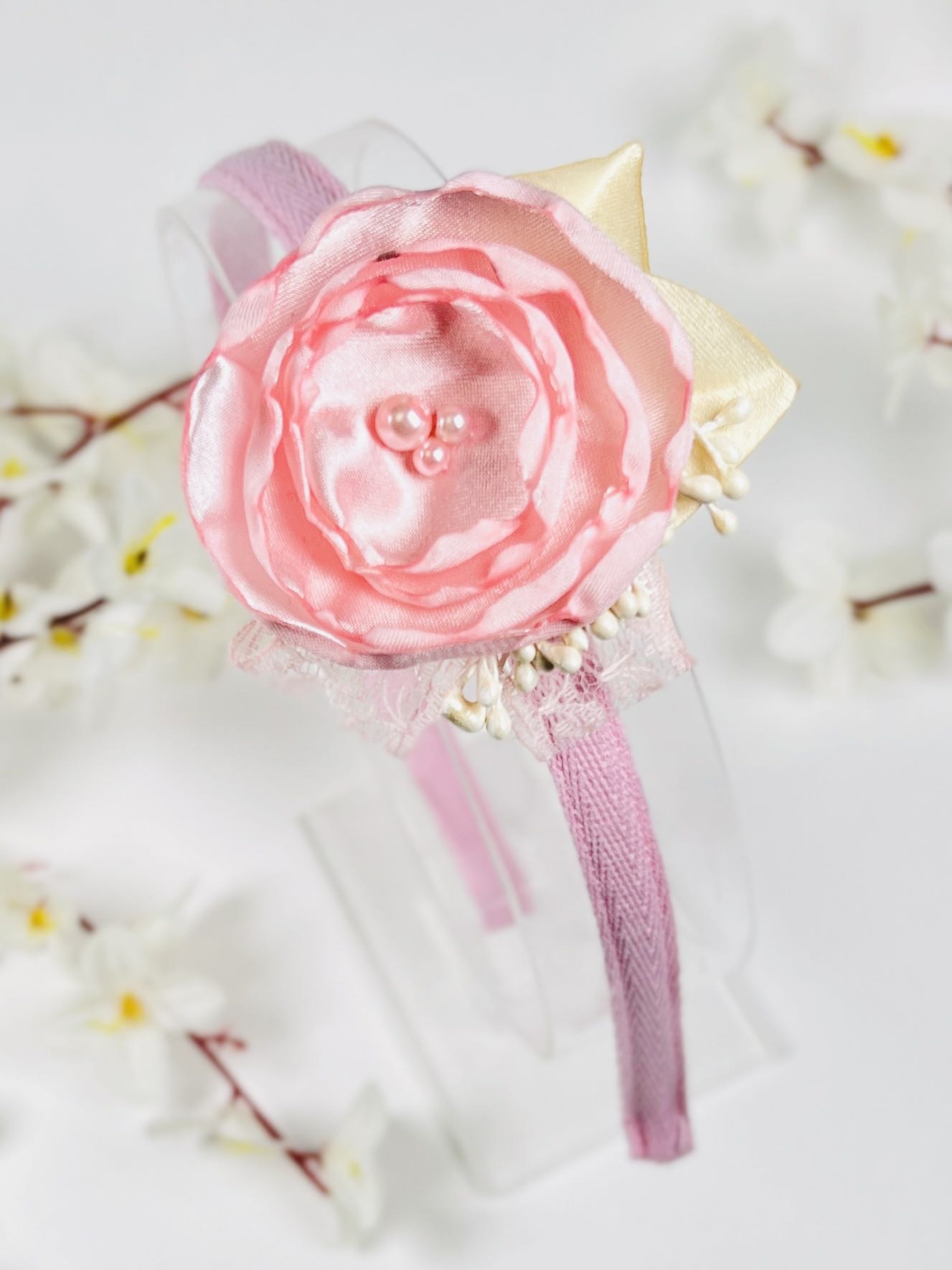 Нежна диадема с цвете ръчна изработка от сатен. Стилен аксесоар за коса за малки и големи деца с красиво цвете отгоре.