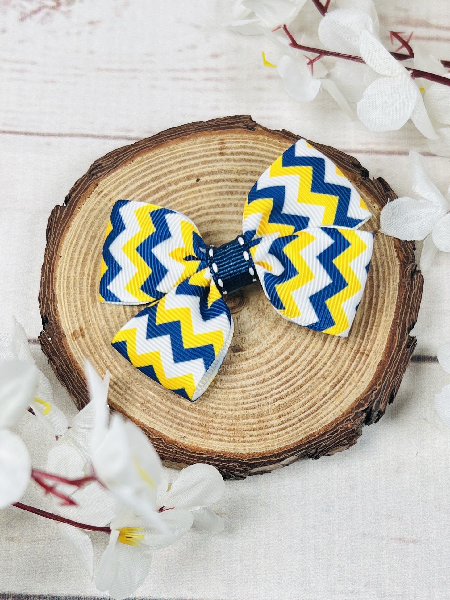 Ярка фиба ръчна изработка с ефектен зиг заг в синьо и жълто. Сладурска фиба панделка за малки момиченца. Стабилния захват и облеченото щъркелче добре държат както фина, така и гъста косичка.