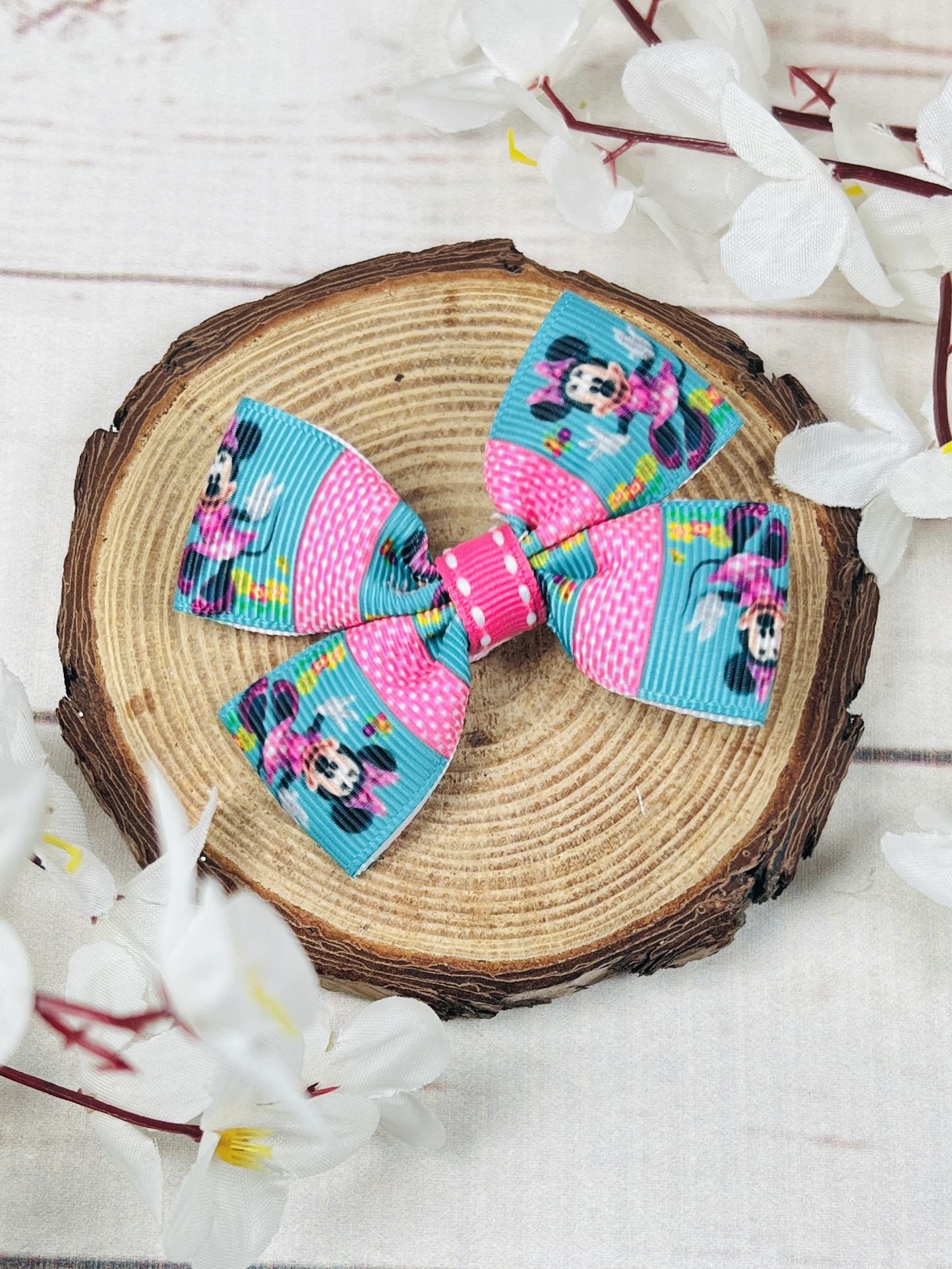Ръчно изработена фиба с панделка в мента и розово с Мини Маус. Весела фиба с любима героиня. Стилен аксесоар за коса за весели девойчета.