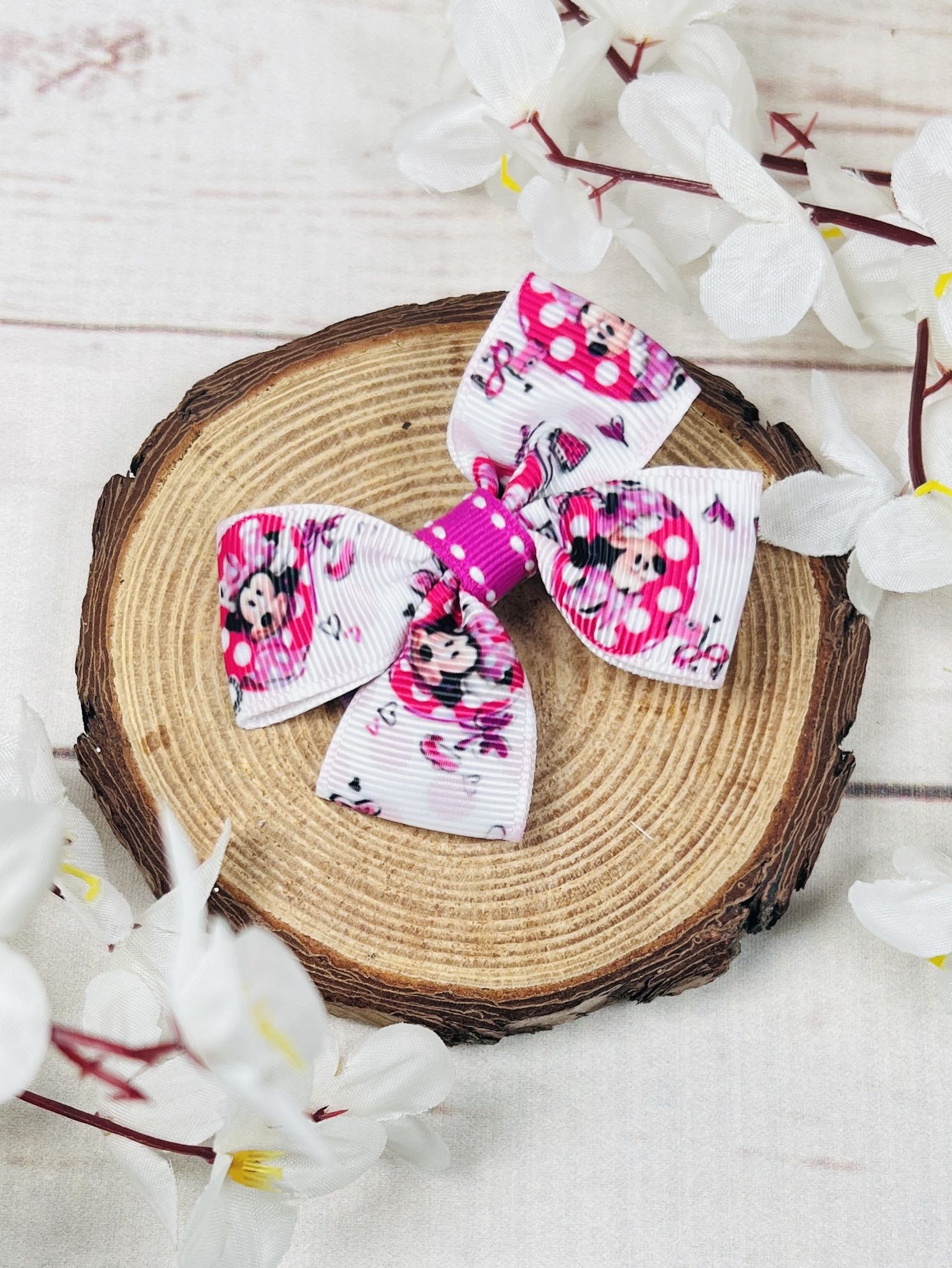 Сладка ръчно изработена фиба с панделка с Мини Мауси. Весела панделка за коса с любима героиня.