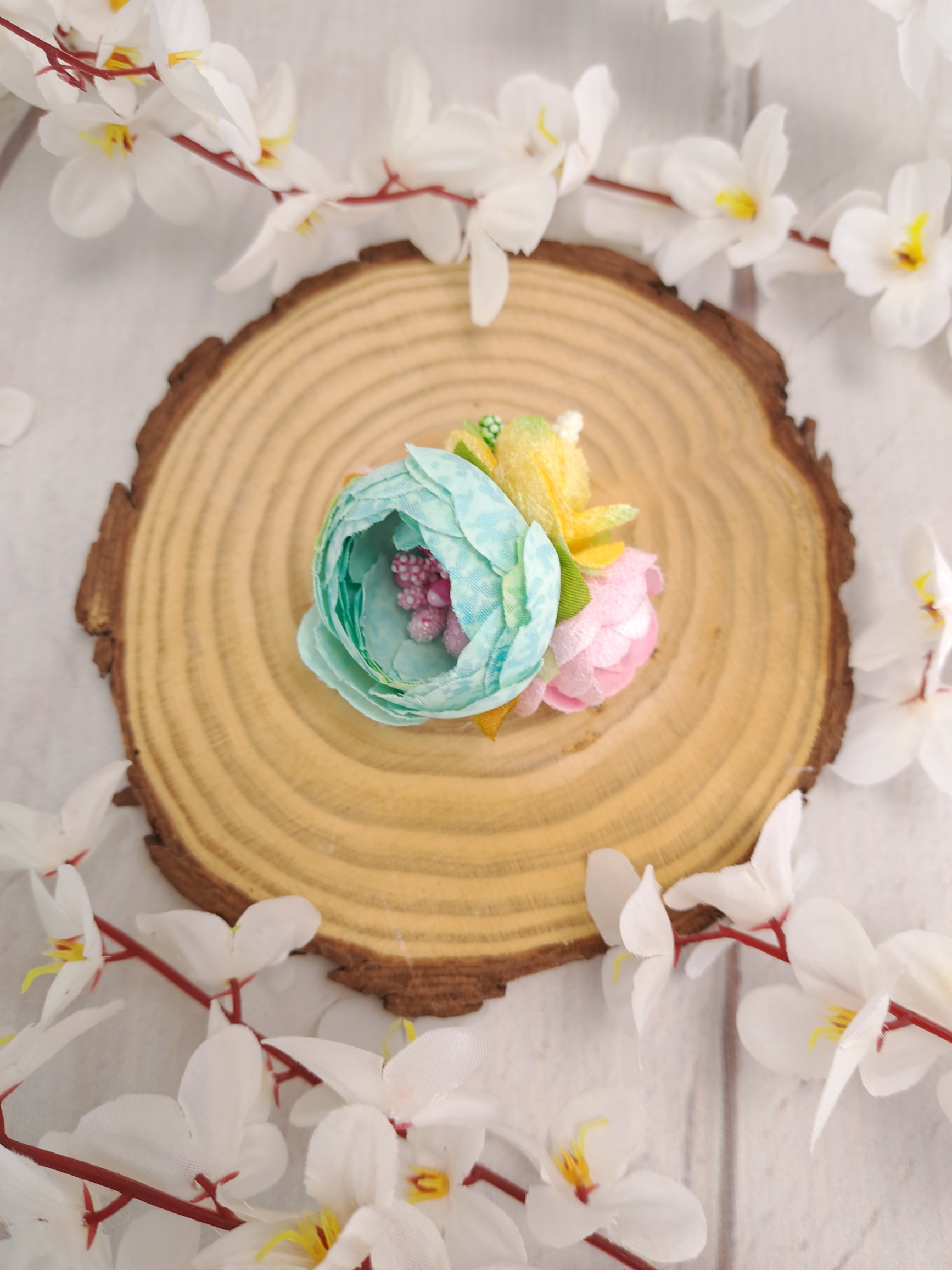 Сладка ръчно изработена фиба с цвете в мента, розово и жълто. С дъх на метнов сладолед с плодова поръска, тази фиба ще донесе много усмивки и весело настроение.