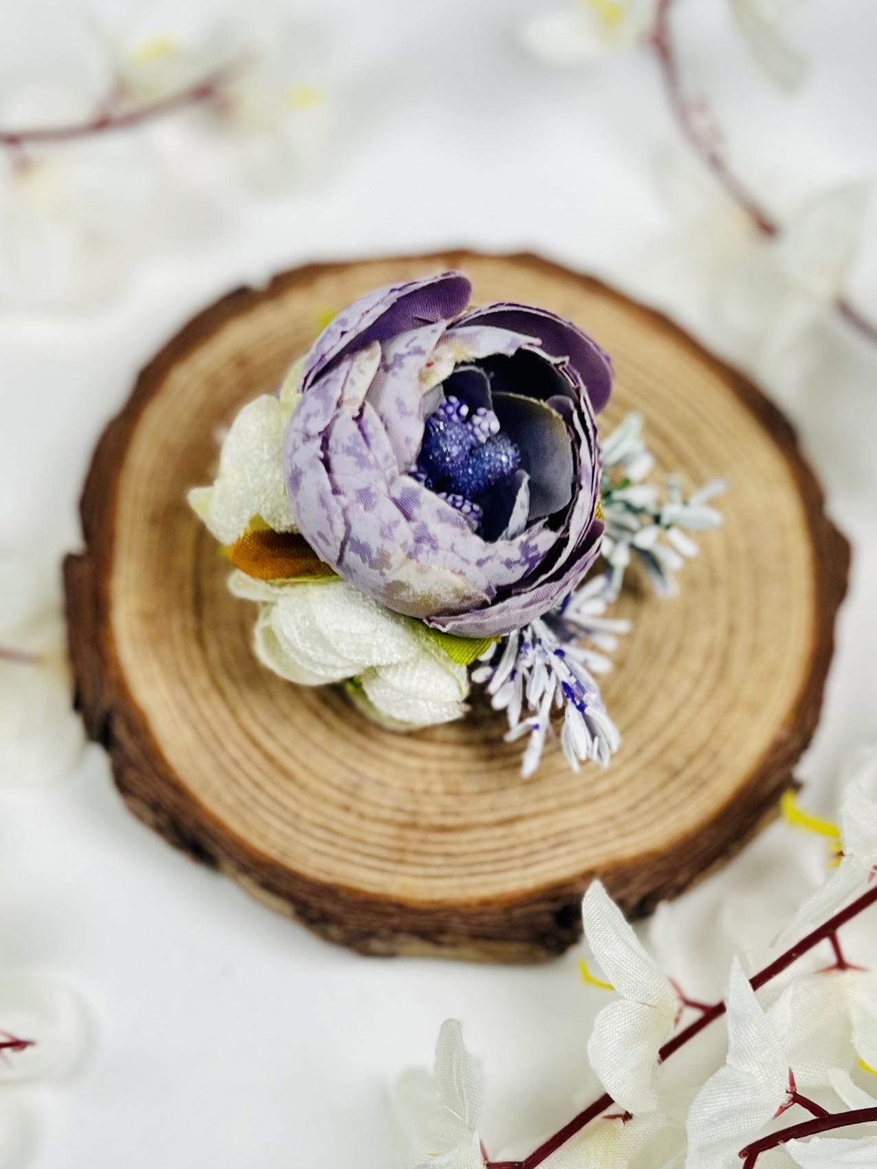 Ръчно изработена фиба с цвете в лилавата гама. Нестандартно решение за смели дами и деца.
