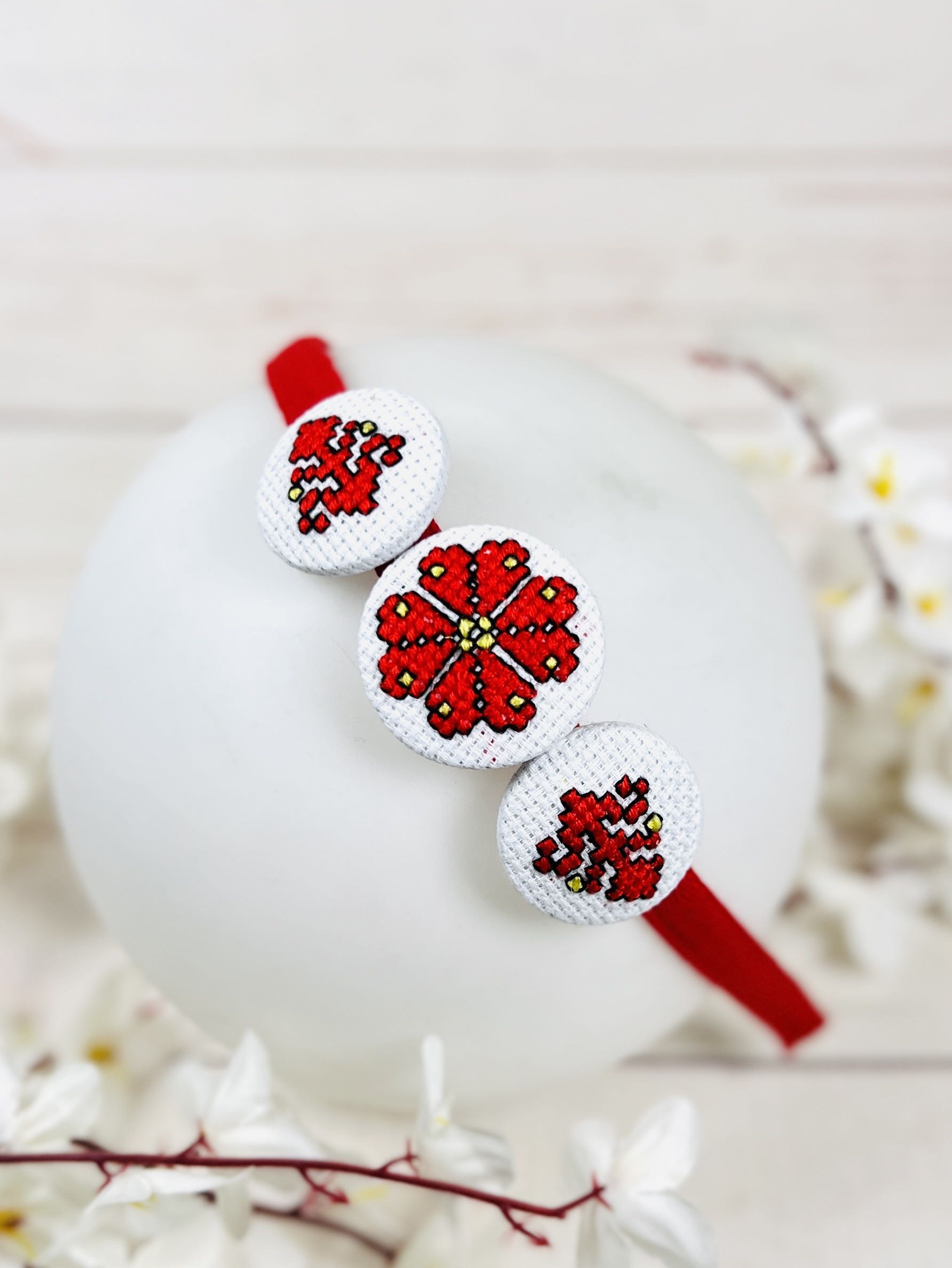 Нежна ръчно изработена диадема с шевица. Приказни копчета с Уникална ръчно бродирана българска шевица в цветовете на маковете. Прекрасен комплект аксесоари за коса с аромат на отминалите дни, полето и слънцето в косите.