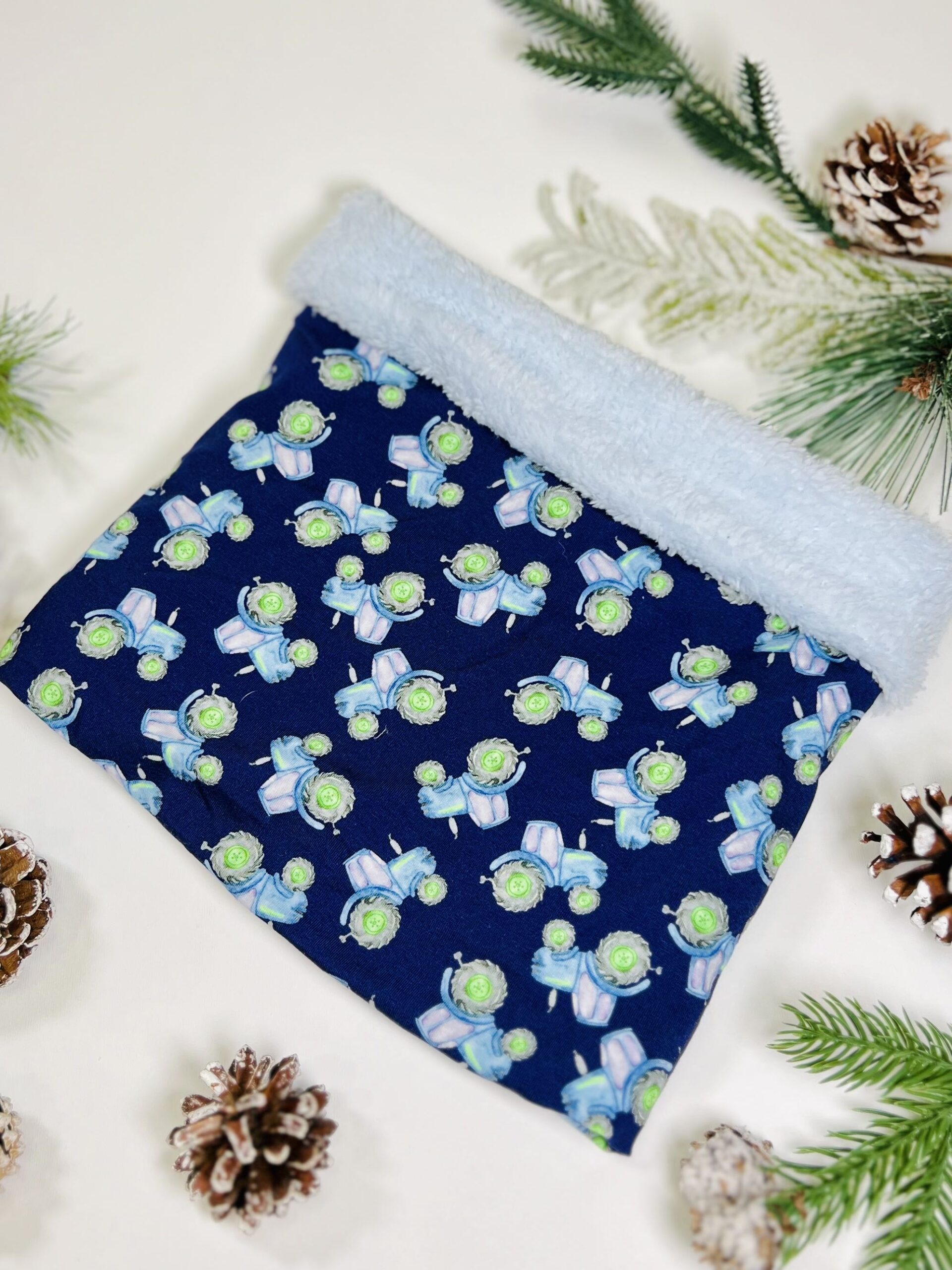 Сладък шал тръба в синьо страктори. Любим топъл аксесоар за зимата за малки и порастнали деца.