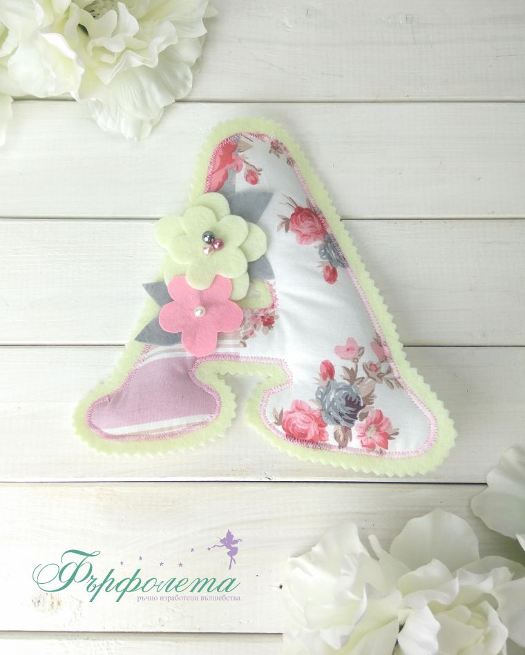 Сладка декоративна буква за детска стая. Нежна буквичка „А” от памучен плат и филц с лек обем. Като самостоятелна буква или в именце, тази декорация ще радва вашето дете.