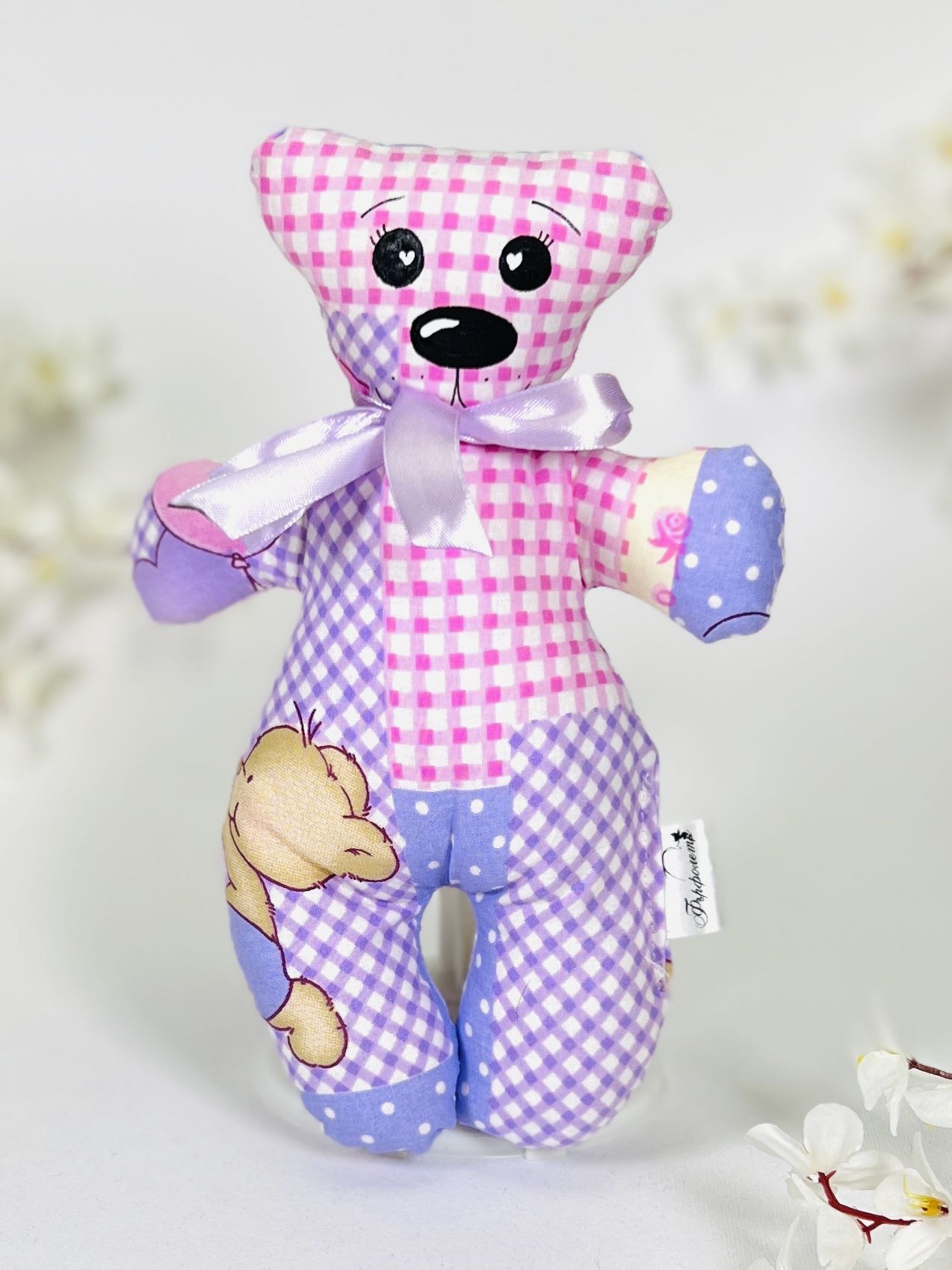 Мече в розово и лилаво като ръчно изработена играчка за бебе. Весело меко мече за гушкане и спане за Вашето дете.