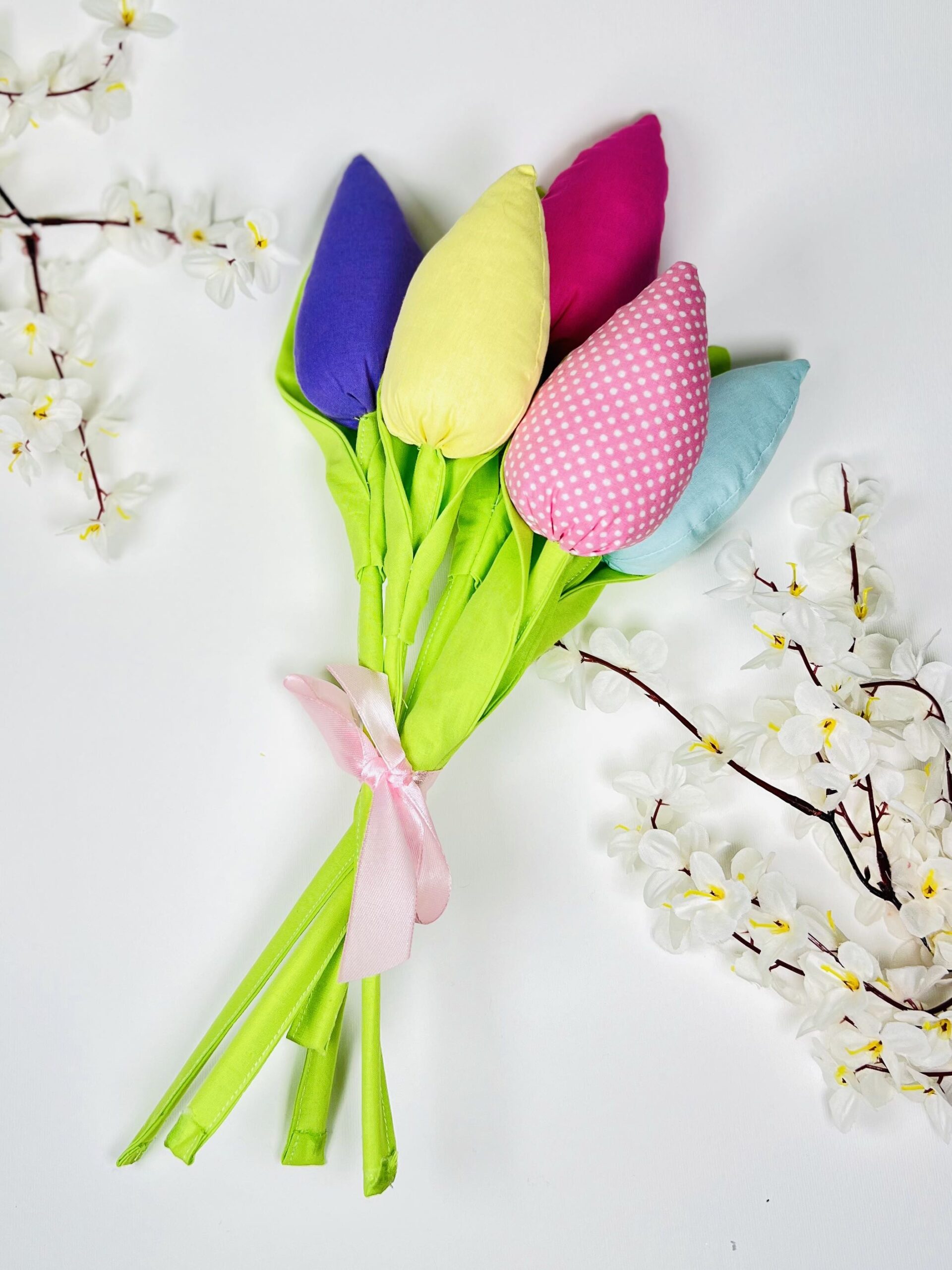 Букет от пет лалета от плат в ярки цветове. Ръчно изработени цветя за специална жена. По повод или без такъв лалетата са весел и оригинален подарък. Напръскани с ароматизатор или парфюм, тези цветя дълго ще излъчват блажен аромат.