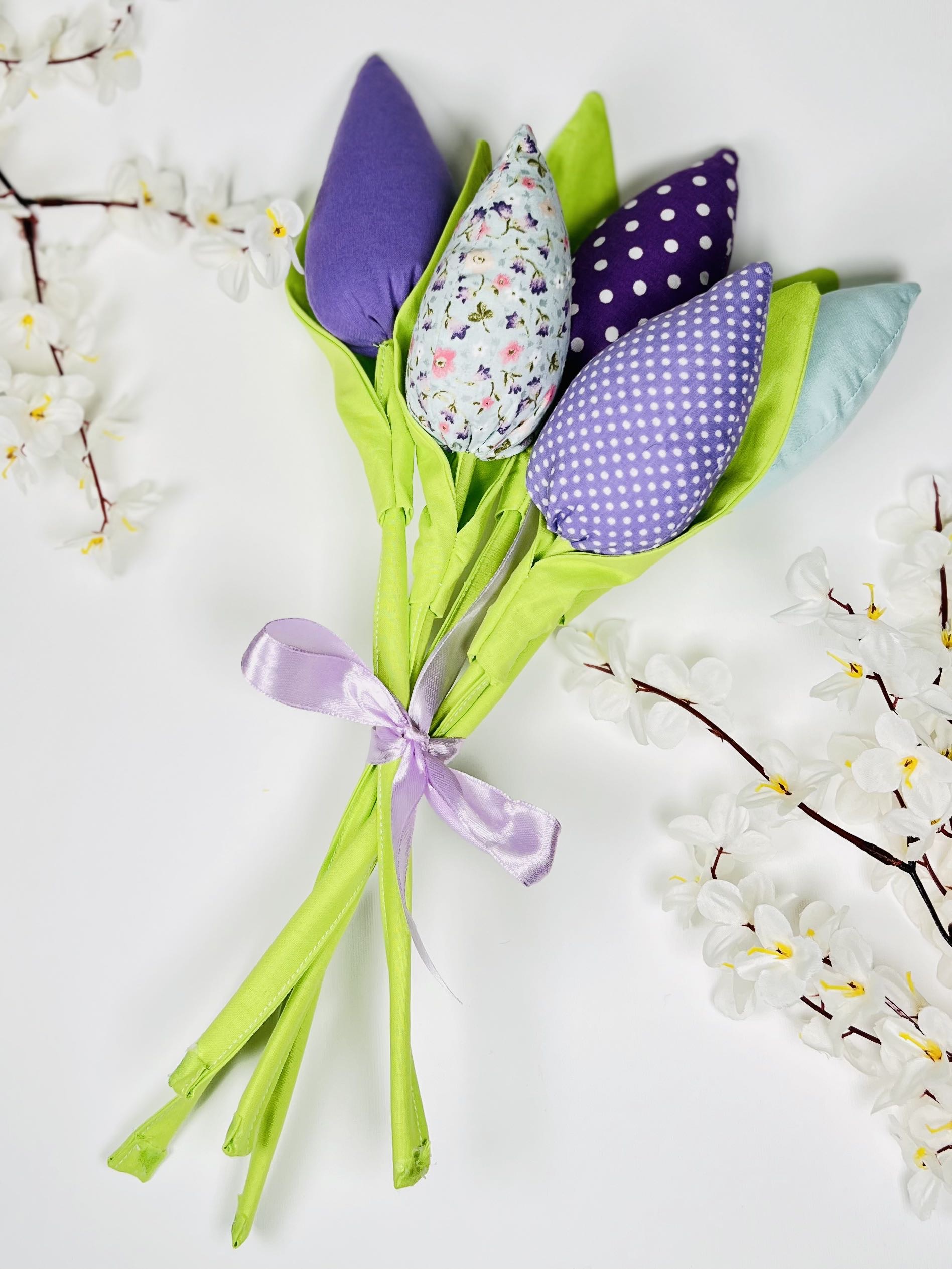 Люляков букет от лалета от плат. Нежни и кокетни цветя за любима жена. Прекрасни лалета за специални поводи. Напръскани с парфюм те ще ароматизират дълго помещението и ще напомнят за специалния момент.